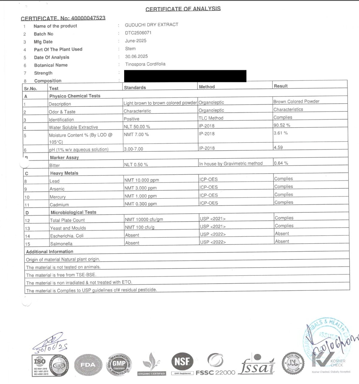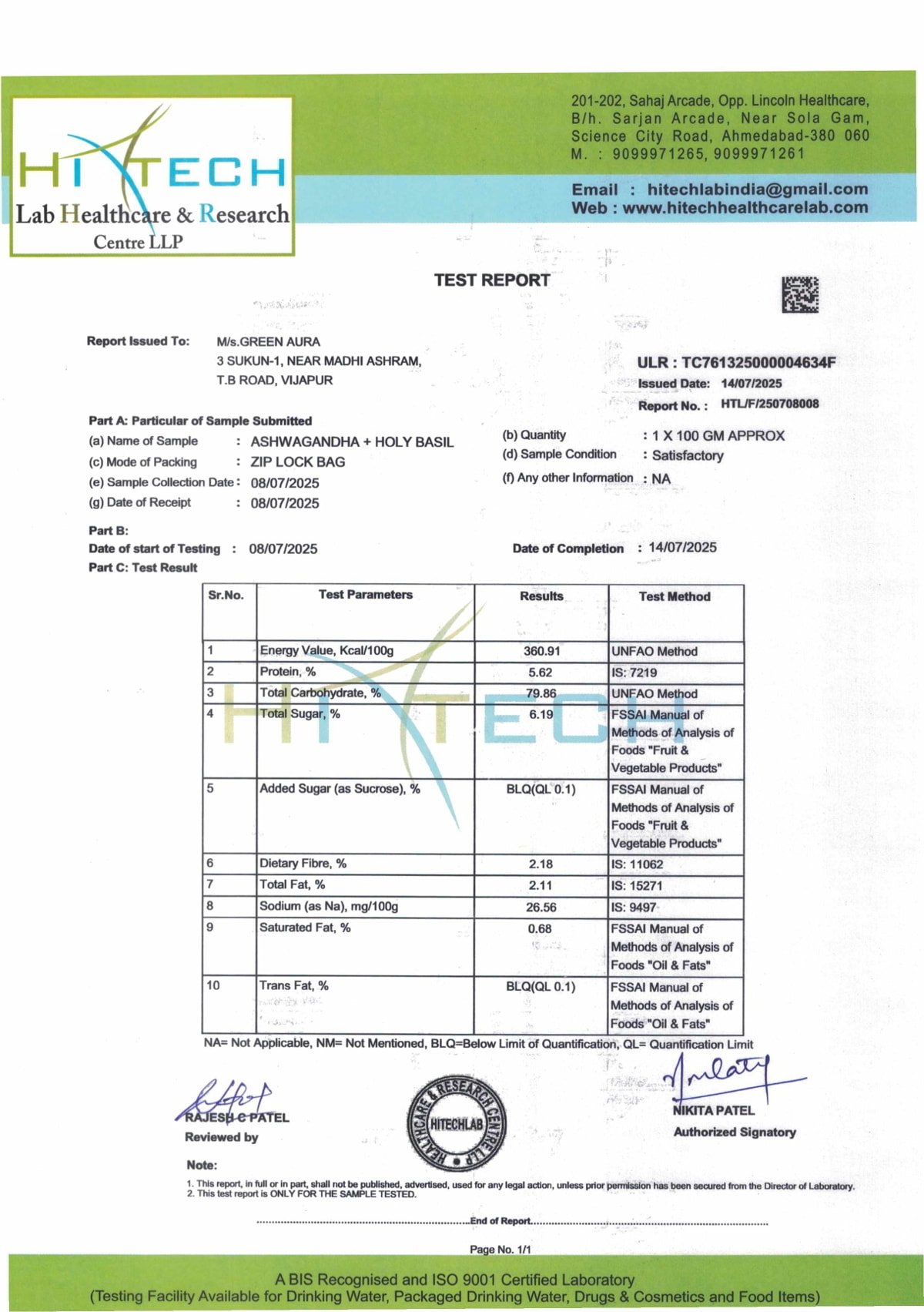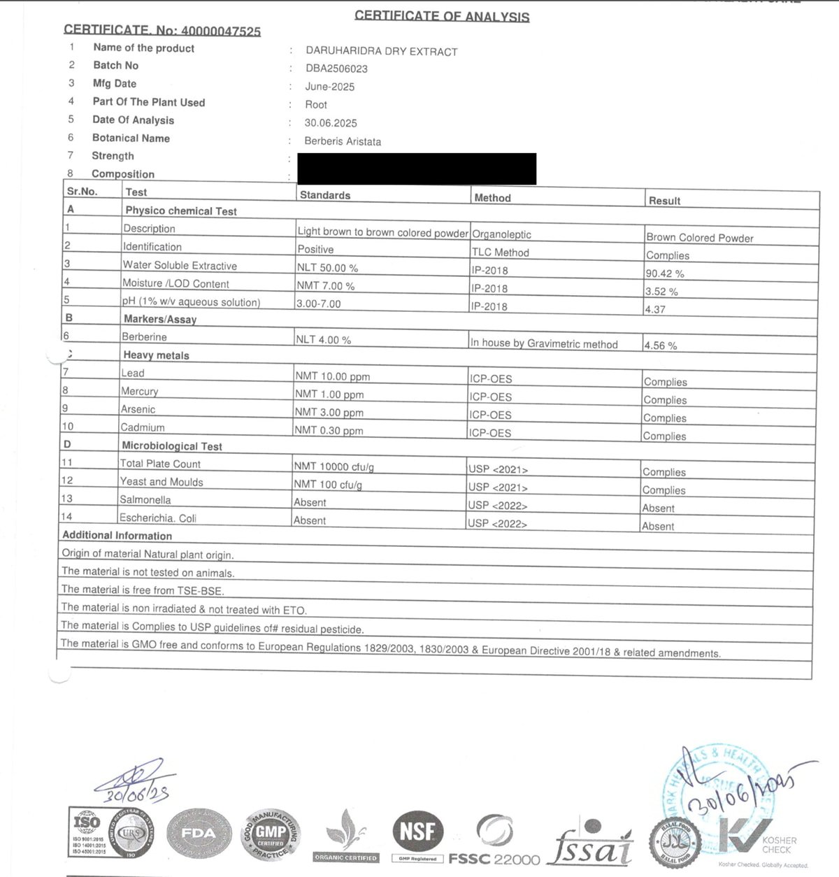 FSSAI (Food Safety and Standards Authority of India) regulates all nutraceuticals and dietary supplements in India. Every Green Aura finished product is registered and approved by FSSAI, ensuring it’s safe and compliant for Indian consumers.