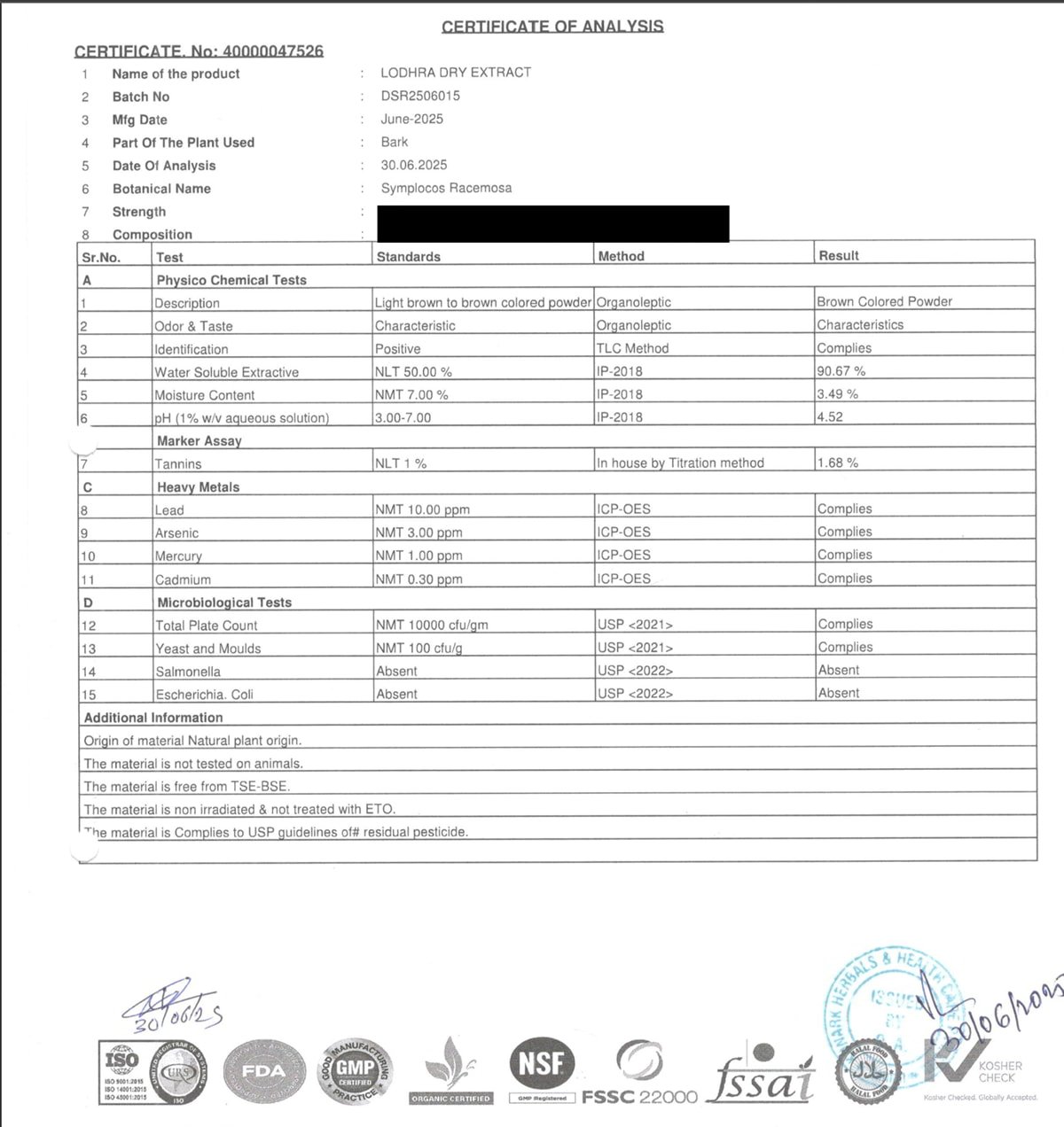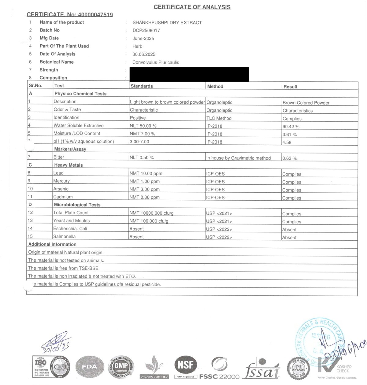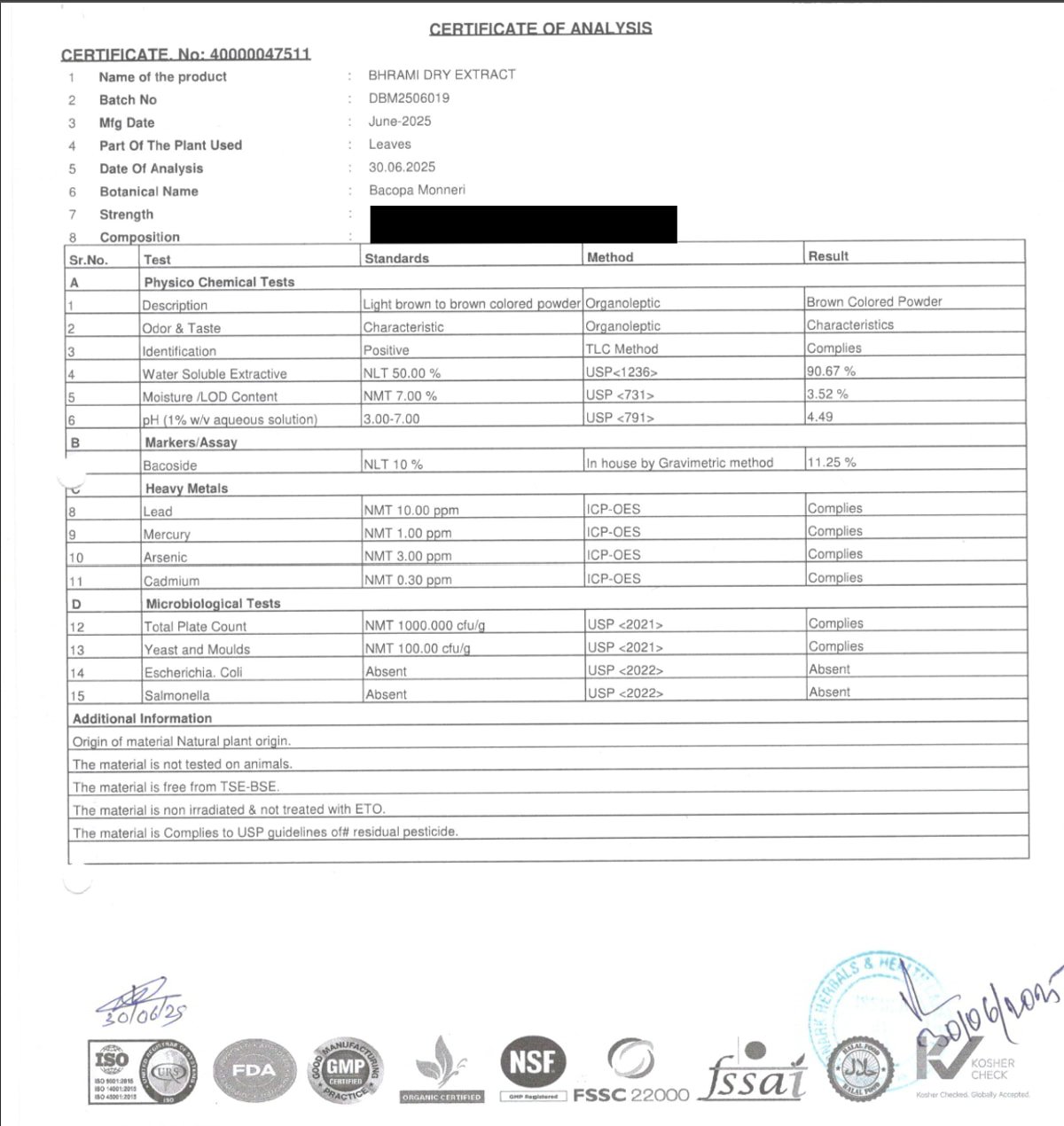 Each raw material is tested for heavy metals, microbial load, pesticides, and authenticity of active ingredients, maintaining uncompromising purity.